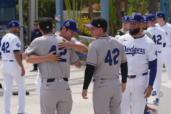 Ayer pudimos disfrutar de ese bonito homenaje. Vimos como la gran estrella de la liga, Ohtani, aparcaba su habitual número 17 para lucir el número 42 de Jackie Robinson. Al igual que Aaron Judge, Corey Seager, Juan Soto y los más de 900 jugadores que conforman actualmente la liga.